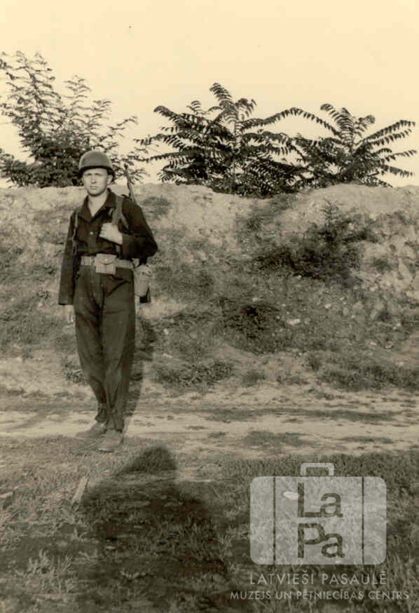 Alfreds Ūdenāns armijas formā ar šauteni sardzes postenī Hānavā (amerikāņu zonā). Daļa no 8850. latviešu inženieru rotas 1951. gada pavasarī. Par šo gadījumu Alfreds Ūdenāns atceras: "Mēs varam arī modri būt un jaunās šautenes pielietot."