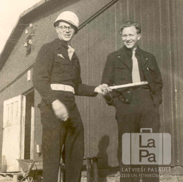 Divi vīrieši melnās uniformās 4054. latviešu darba rotā Gisenē (amerikāņu zonā). No kreisās: dienenieks Ozoliņš un Alfreds Ûdenāns.