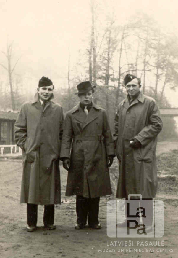Trīs vīrieši melnos formas tērpos ar gariem mēteļiem no Gisenes (amerikāņu zonā), dodoties atvaļinājumā uz pilsētu. No kreisās: Harijs Nadoļskis, Egons Plikšs un Alfreds Ûdenāns.