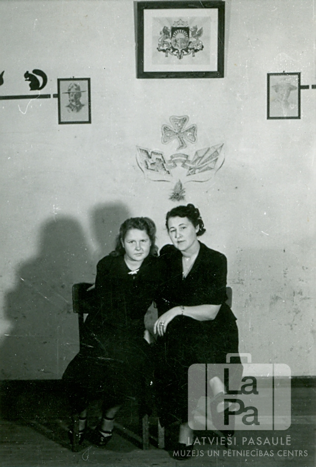 Māte un meita, pamatskolu beidzot Badaiblingas nometnē pie Minhenes (amerikāņu zonā) 1951. gada pavasarī. Aizmugurē uz sienas ir Latvijas valsts ģerbonis. No kreisās: Anda Jaunliniņa (pr. Sūna Cook) un Erna Jaunliniņa.