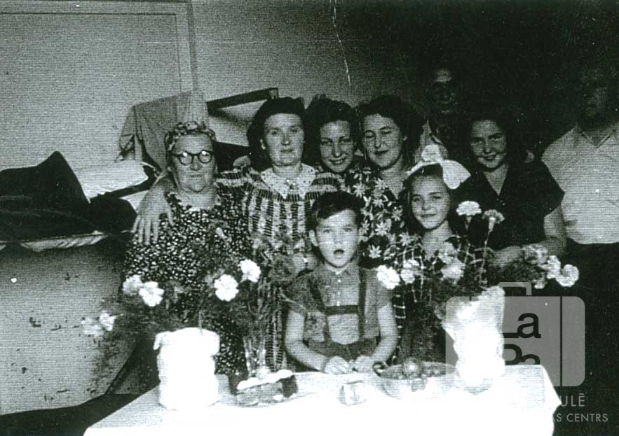 Jaunliniņi svin "Ernas” kopā ar Ritteru ģimeni Gronā pie Brēmerhāfenes (angļu zonā). Priekšā, no kreisās: Juris un Ināra Jaunliniņi. Aizmugurē, no kreisās: Ritteru vecmāmuļa, Erna Rittere, Elfrīda Ješiņa, Erna Jaunliniņa, Anda Jaunliniņa (pr. Sūna Cook) un Rittera kungs.