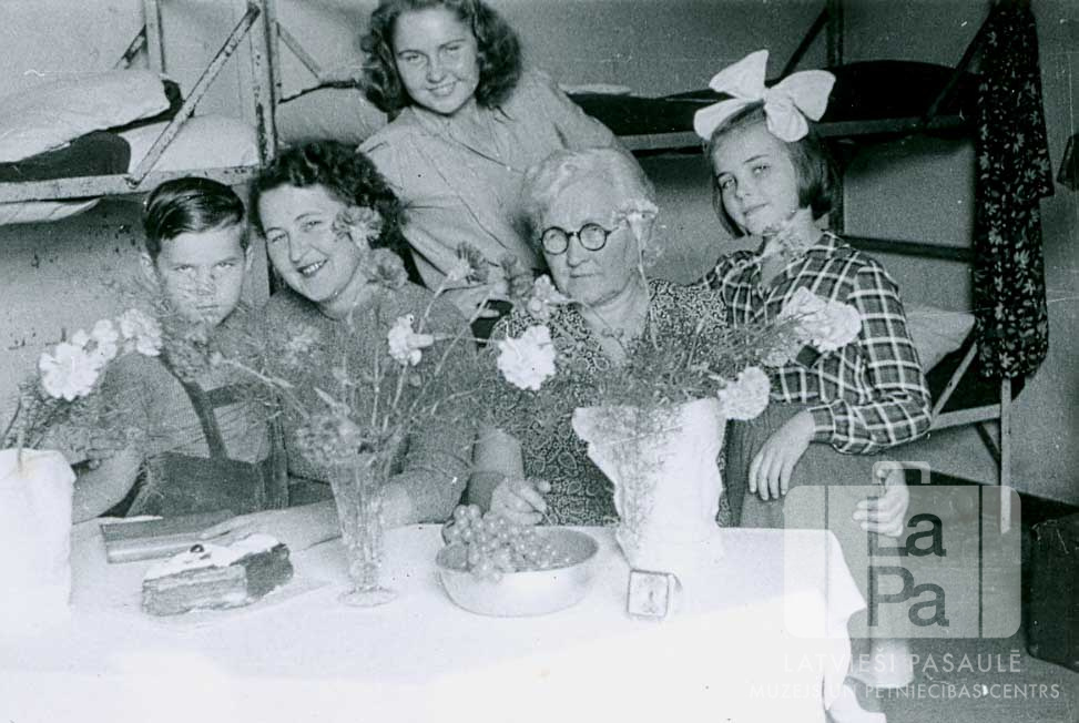 Jaunliniņu ģimeni, gaidot kuģi Gronā pie Brēmerhāfenes (angļu zonā). Priekšā Juris Jaunliniņš, Erna Jaunliniņa, Elza Klētniece un Ināra Jaunliniņa. Aizmugurē Anda Jaunliniņa (pr. Sūna Cook).