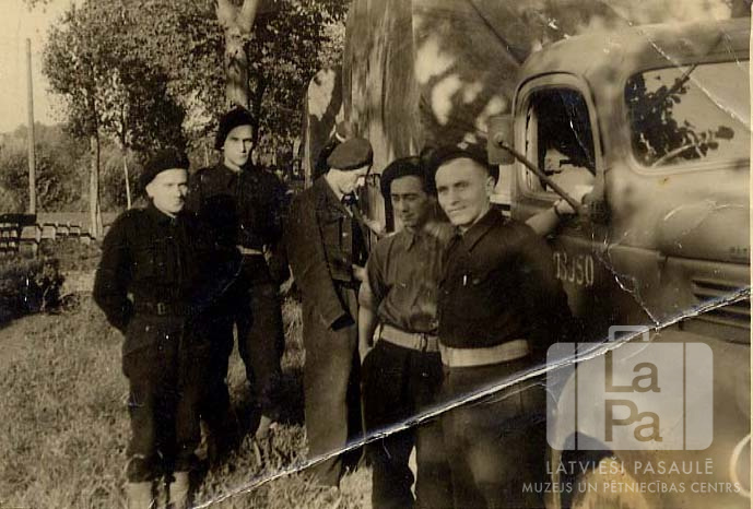 Pieci vīri "melno vienības" uniformās pie smagās automašīnas angļu zonā. Pirmais no labās: Pēteris Sebris.
