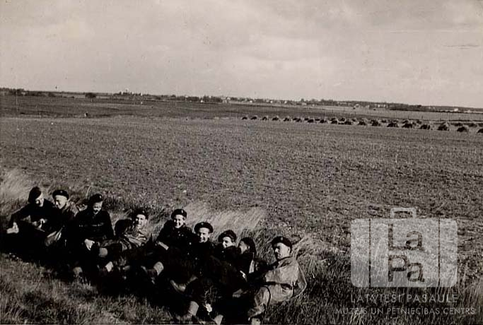 Vīru grupa "melno vienības" uniformās atpūtā lauka malā angļu zonā. Pirmais no labās: Pēteris Sebris.