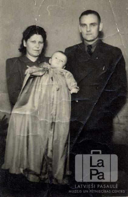 Krustvecāki ar krustdēlu pēc kristībām. Priekšā Andrejs Sebris, aizmugurē Lūcija Bluķis un Rūdis Plūme.
