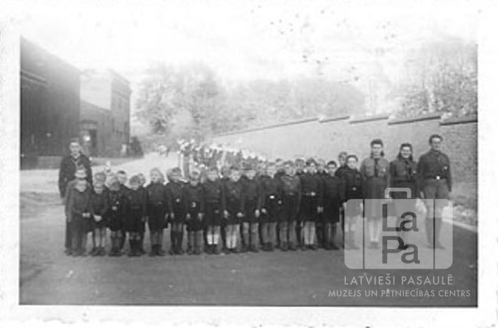 Mazskauti ar vadītājiem mazskautu solījuma dienā Iceho nometnē (angļu zonā). Pirmais no kreisās: Nikolajs Lapkašs. Pirmie no labās: Antons Kalniņš, Ilga Danielsone un Mitriķītis (?).