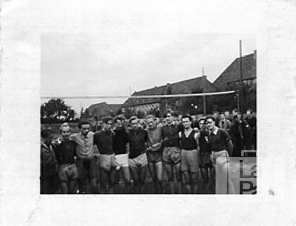 Pinnebergas un Iceho ģimnāzijas sportisti Pinnebergas nometnē (angļu zonā). Aizmugurē volejbola tīkls. No kreisās: nezināms, Vijulis Graudiņš, Pēteris Strungs, ? Inveiss, Andris Miglis, ? Inveiss, Inārs Brūveris, nezināms, Gunārs Ozoliņš, Nikolajs Lapkašs.