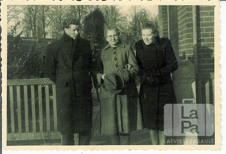 Strantes ģimene, gatavojoties doties ciemos 1948. gada Ziemassvētkos Grēvenes nometnē (angļu zonā). No kreisās: Paulis Strante, Elza Strante, Annija Bergs.