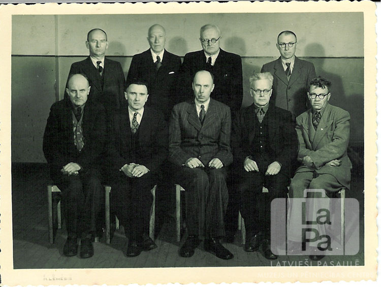 Luterāņu draudzes padome Grēvenes nometnē (angļu zonā). Pirmajā rindā, no kreisās: ? Ulmanis, ? Meistars, ? Mūrnieks, ? Būmanis, ? Sautiņš. Otrajā rindā, no kreisās: ? Laiviņš,? Grigens, Kārlis Miglis, Haralds Sūna.
