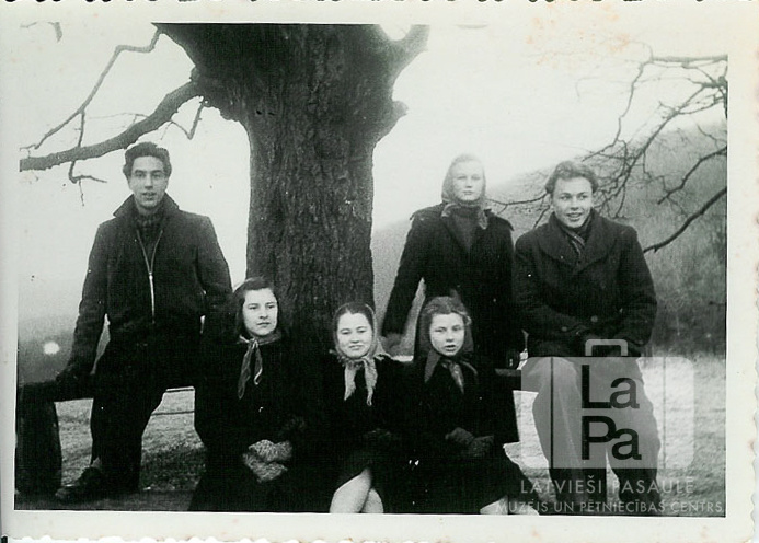 Vidusskolnieku grupa pastaigā kalnā pie Blombergas nometnes (angļu zonā) 1949. gada ziemā. Priekšā, no kreisās: Biruta Freimane-Brūns, Dzintra Ozoliņa-Kornets, Ieva Ķezbere. Aizmugurē, no kreisās: Olģerts Sniedze, Maija Miglis-Stuberovskis, Aivars Savelis.
