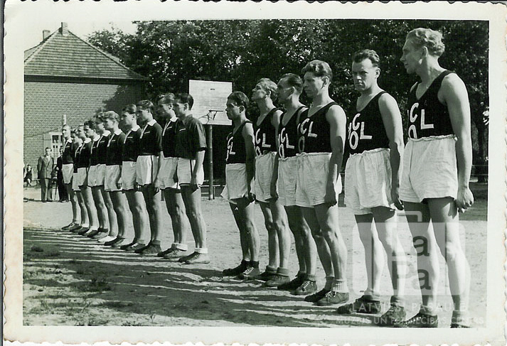 Sportistu rinda Grēvenes nometnē (angļu zonā). Rindā stāv, no kreisās: Edvīns Švolmanis, nezināms, nezināms, nezināms, Alfrēds Hermanovskis, Arvīds Berkholds, nezināms, Andris Miglis, Uldis Pudists, Valters Nollendorfs, Imants Ikstrums, Aivars Savelis, Osvalds Būmanis, Mintauts Caune, Gunārs Lazdiņš, nezināms.