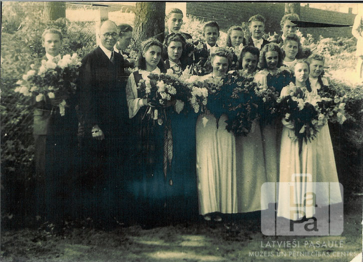 Jauniešu iesvētīšana luterāņu vācu baznīcā Iceho nometnē (angļu zonā). Puišiem uzvalki, meitenēm kleitas; visiem iesvētāmajiem puķes rokās. Pirmajā rindā, no kreisās: Biruta Tormane-Bergmanis, Aleksandra Šebedeva. Otrajā rindā, no kreisās: prof. Edmunds Šmits, Gunta Ivanovs, Mudīte Ivanovs, nezināms, Dzidra Auere, nezināms, nezināms. Trešajā rindā, no kreisās: Arvīds Veits, nezināms, Edgars Strauts, Valdis Auers, Rita Eversone, Elmārs Knābe, nezināms.