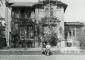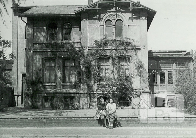 Veca divstāvu dzīvojamā māja, divas meitenes sēž uz sieniņas mājas priekšā