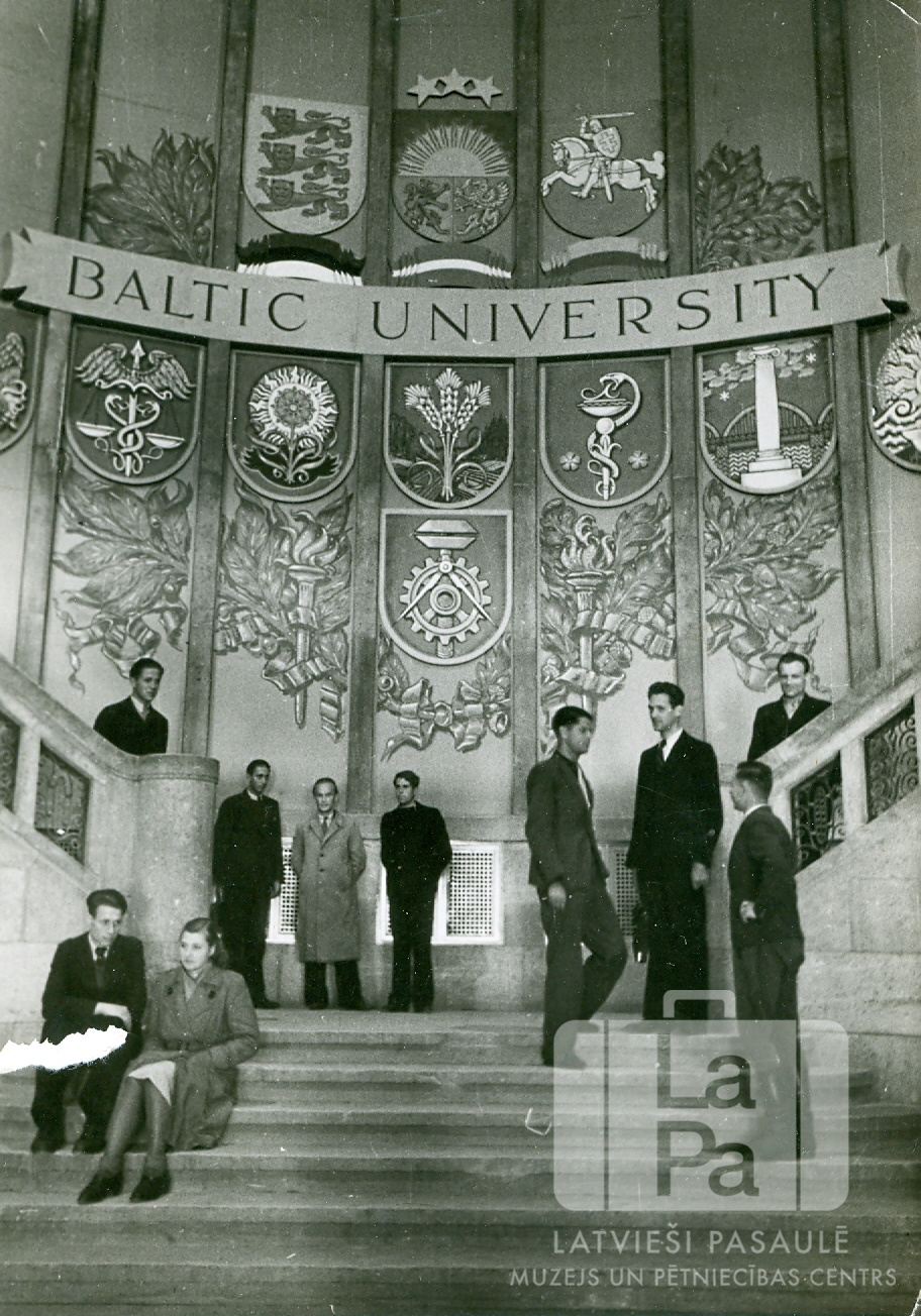 Baltijas Universitātes ieejas halle Vēstures muzejā Hamburgā (angļu zonā) ar grafiķa V. Krūmiņa gleznotajiem Baltijas valstu vapeņiem un fakultāšu emblēmām.
