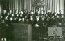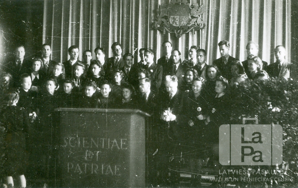 Cilvēku grupa Latvijas Universitātes gada svētku atceres pasākumā Baltijas Universitātē Hamburgā (angļu zonā). Uz prezentāciju podesta rakstīts LU moto "Scientiae et patriae" (Zinātnei un tēvijai); aizmugurē uz sienas redzams Latvijas Republikas ģerbonis.