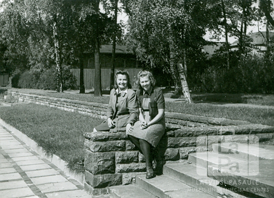 Baltijas Universitātes studentes sēž uz zema mūra Zoo nometnē Hamburgā (angļu zonā). No kreisās: Aina Zīberga un Ruta Zommere.