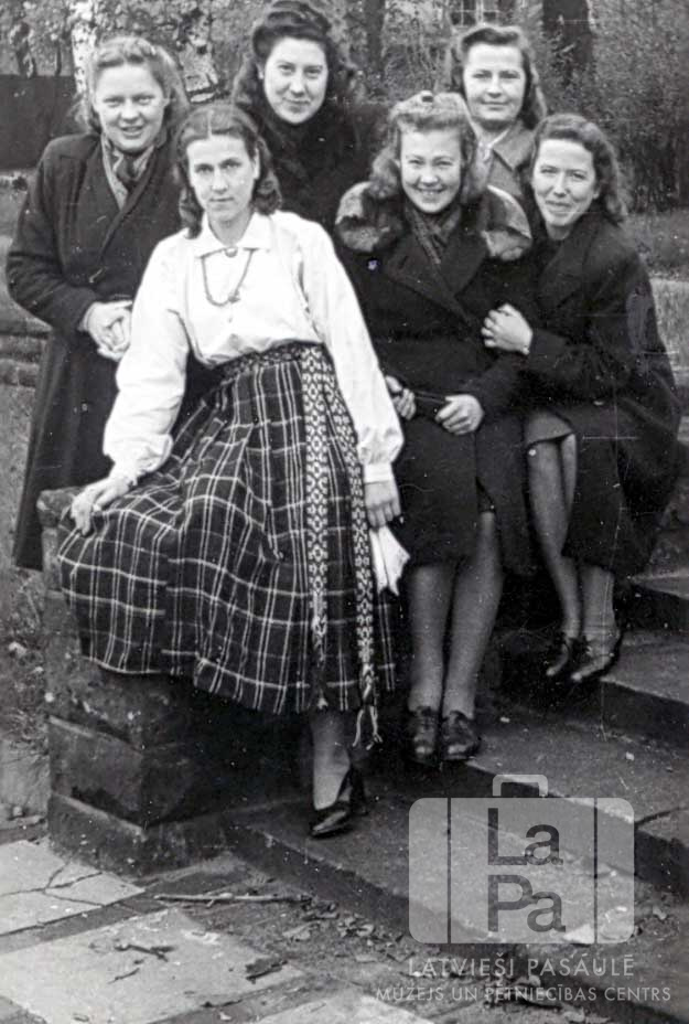 Sešas Baltijas Universitātes studentes Zoo nometnē Hamburgā (angļu zonā). Piecas ir ģērbušās mēteļos, viena ir tautastērpā.