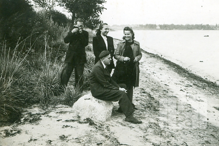 Baltijas Universitātes studenti un pasniedzējs izbraukumā ūdens malā pie Pinnebergas (angļu zonā). Priekšā, uz akmens: profesors L. Slaucītājs. Aizmugurē, trešā no kreisās: Aina Zīberga.