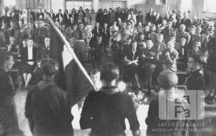 Valsts svētku akts Neietingas nometnes cilvēku pilnajā lielajā zālē (amerikāņu zonā). Priekšplānā skauti ar Latvijas valsts karogu.