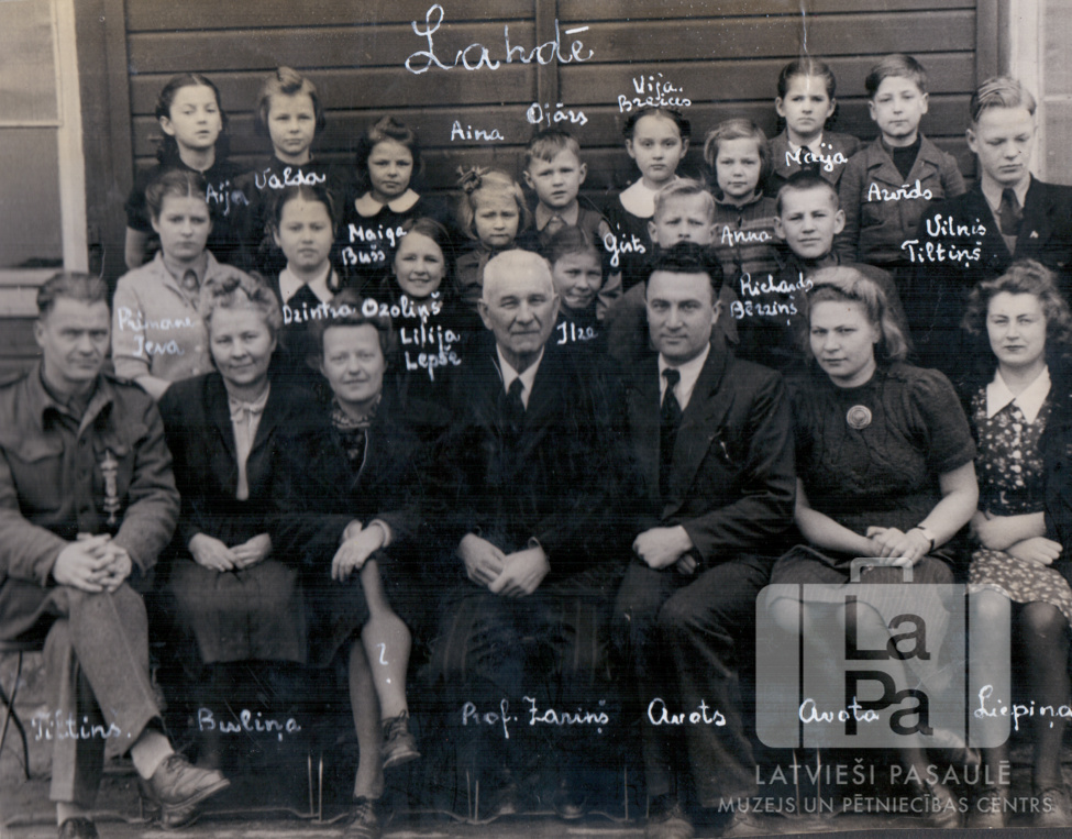Pamatskolas klases ar skolotājiem Lādes nometnē (angļu zonā) ap 1947. gadu. Pirmajā rindā, no kreisās: ? Tērtiņš (?), ? Buliņa, prof. ? Zariņš, ? Avots, ? Avota, ? Liepiņa. Otrajā rindā, no kreisās: Ieva Rimane (?), Dzintra Ozoliņš, Lilija Lepše, Ilza ?, Ģirts ?, Rihards Bērziņš, Vilnis Tiltiņš. Trešajā rindā, no kreisās: Aija ?, Valda ?, Maiga Buša, Aina ?, Ojārs ?, Vija ?, Anna ?, Marija ?, Arvīds ?.