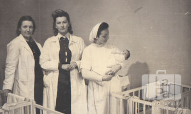 Medicīnas personāls Frilles dzemdību namā pie Lādes (angļu zonā) ap 1947. gadu. No kreisās: ? Vilma, Olga Olavs (dz. Fridrihsons), Sofija ?.