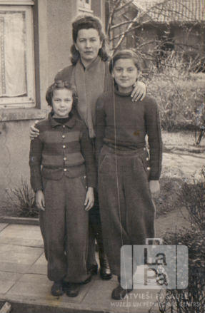 Olavs ģimene pie mājas Lādē. Olgai Olavs strādāja kā ginekoloģe vietējā apkaimē un tā ģimene nedzīvoja DP nometnē, bet viņiem bija piešķirtas trīs istabas vietējā iedzīvotāju mājā. Bildē meitenēm mugurā ir bikses šūtas no segām.