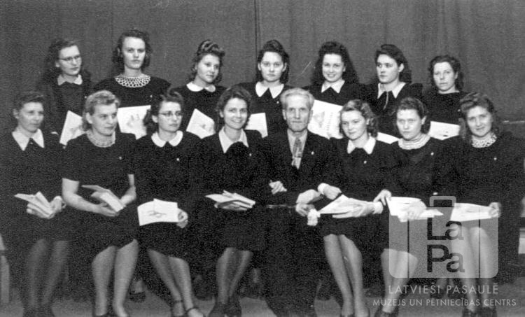 Kārļa Skalbes ģimnāzijas 3. izlaiduma klases skolnieces ar klases audzinātāju Voldemāru Vārpa Fišbahas nometnē (amerikāņu zonā). Pirmajā rindā, no kreisās: Vija Ose, Ligita Kuple, Regīna Grabe, Dzidra Robiņa, skolotājs Voldemārs Vārpa, Ilga Bauere, Aina Auziņa un Līvija Norgello. Otrajā rindā, no kreisās: Glorija Ādamsone, Velta Vasiļevska, Aina Kažoka, Anna Klungste (pr. Staltmane), Tamāra Blinova, Elga Jurgena un Ruta Pokornija.