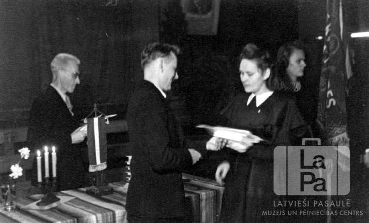 Absolvente Anna Klungste saņem ģimnāzijas beigšanas apliecību Fišbahas nometnē (amerikāņu zonā). Uz galda sveces svečturī un Latvijas karodziņš. No kreisās: skolotājs Voldemārs Vārpa, direktors Ernests Ābele, Anna Klungste (pr. Staltmane), nezināms.