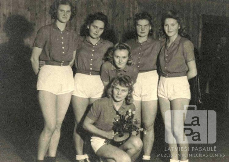 Bastkebolistes sporta tērpos Nirnbergas nometnē (amerikāņu zonā). Priekšā Velta Bebre. Aizmugurē, no kreisās: Mirdza Irbe, Anna Klungste (pr. Staltmane), Erna Pērkone, Ruta Ezergaile un Astra Kažoka. Par šo gadījumu Anna Staltmane (dz. Klungste) atceras: "Toreizējā Valkas DP nometnes meiteņu basketbola komanda bija spēcīga, jo abas Velta Bebre un Mirdza Irbe kādreiz spēlēja Latvijas valsts komandā."