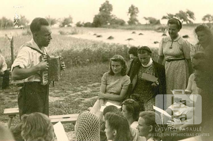 Kora "Dziesmu Vairogs" mēģinājums Groshābersdorfā (amerikāņu zonā). Pirmais no kreisās (ar akordeonu) – diriģents Arnilds Kalnājs.