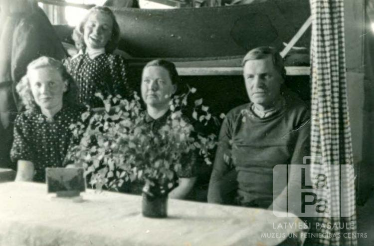 Dzeņu ģimene savā barakas stūrītī Mercfeldas nometnē (amerikāņu zonā) 1946. gada Lieldienās. No kreisās: Antonija Dzene (pr. Sinkēviča), Paulīne Dzene (pr. Zadvinska), Veronika Dzene un Antons Dzenis. Fotogrāfijas labajā pusē var redzēt pakārtās segas/ priekškarus, kas lielo barakas istabu sadalīja, lai ģimenei būtu pašiem savs nodalījums.