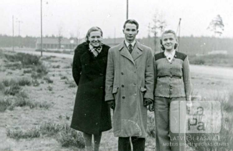 Māsas Dzenes pastaigas laikā ar radinieku – ērģelnieku Romualdu Dzeni – Fišbahas nometnē (amerikāņu zonā). No kreisās: Antonija Dzene (pr. Sinkēviča), Romualds Dzenis un Paulīne Dzene (pr. Zadvinska).