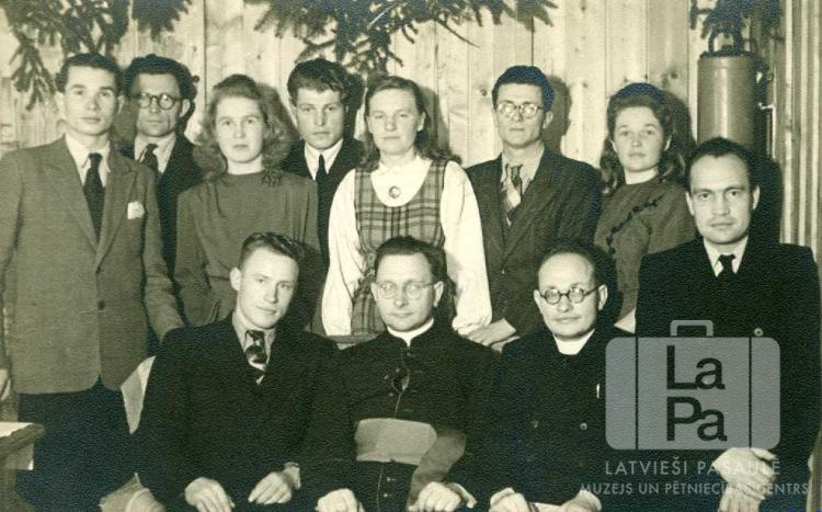 Studentu organizācijas "Dzintars” Erlangenes universitātes vienība Valkas nometnē Nirnbergā (amerikāņu zonā) ar prāvestu Juri Pudānu. Pirmajā rindā, no kreisās: Jānis Veikšins, nezināms, prāvests Juris Pudāns, nezināms. Otrajā rindā, no kreisās: ērģelnieks Romualds Dzenis, Staņislavs Gorsvāns, Jozefīne Drejere, ? Bušs, Antonija Dzene (pr. Sinkēviča), Jānis Velde, nezināms.
