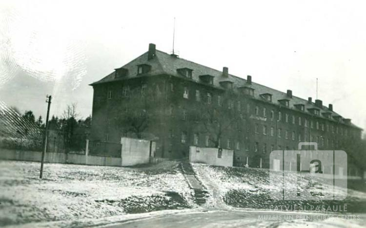 Latviešu kazarmas Valkas nometnē Ulmā (amerikāņu zonā) ziemā. Četrstāvīga ēka, priekšplānā kāpnes.