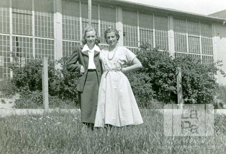 Divas draudzenes pie Švābu Gmindes nometnes ēkas (amerikāņu zonā). No kreisās: Antonija Sinkēviča (dz. Dzene) un dziedātāja Antoniņa Vaivoda – Garance (saukta arī Antonīna Vaivoda Garance).