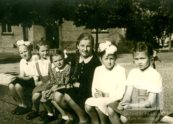 Sešas skolnieces Vīsbādenes nometnē (amerikāņu zonā) 1946. gada rudenī. No kreisās: Ārija Brekte (pr. Breikša), Benita ?, Agīte Lūse, Ināra Gerliņa, Lidija Valaine un Ligita Briede. Par šo gadījumu Ārija Breikša (dz. Brekte) atceras: "Svētdienas rītā atpūtā pēc sešām skolā pavadītām dienām."