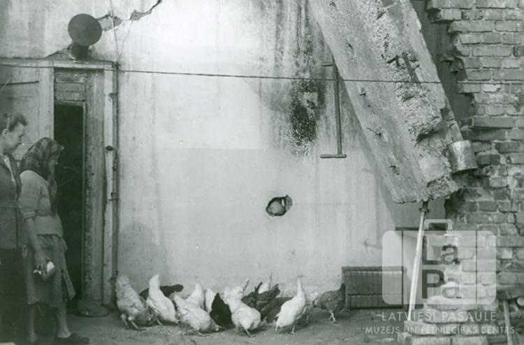 Divas sievietes pie vistām, kas knābā graudus Fuldas nometnē (amerikāņu zonā) 1947.–1948. gadā. Labajā pusē redzama kara postīta ēkas daļa.