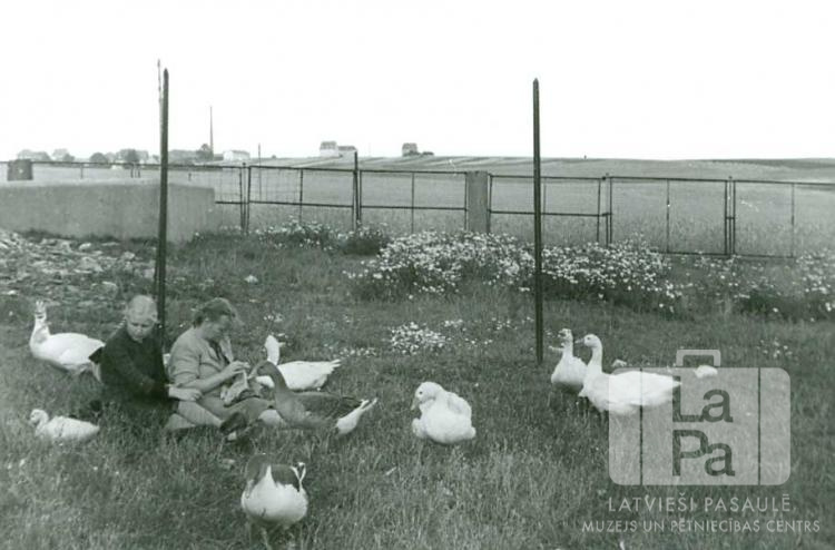 Divas sievietes, ganot zosis Fuldas nometnē (amerikāņu zonā) 1947.–1948. gadā. No kreisās: Ārija Brekte (pr. Breikša) un Hilda Brekte. Par šo gadījumu Ārija Breikša (dz. Brekte) atceras: "Zosis ganot. Ārijai parasti bija līdz grāmatas, ko lasīt."