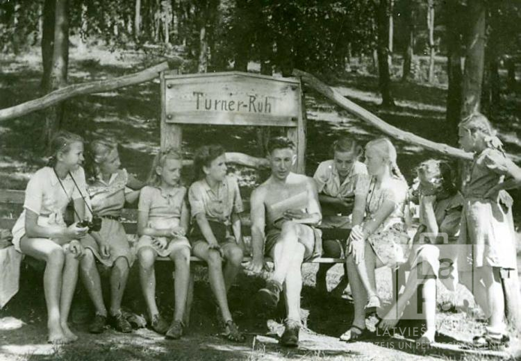 Skolnieču grupa ar skolas pārzini atpūtas brīdī mežā pie Fuldas nometnes (amerikāņu zonā) 1948. gada vasarā. Aiz viņiem zīme "Turner-Ruh". No kreisās: nezināms, Gunta Kanderovska, Astrīda ?, Sibilla Dālle, skolas pārzinis ? Dronis, Juta ?, Ārija Brekte (pr. Breikša), Liāna ? un Anna Klincāne.