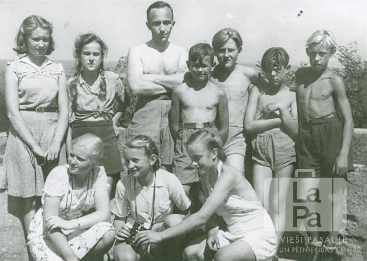 Skolēnu grupa ar skolotāju pamatskolas pārgājienā uz "Turnern-Ruh" mežu pie Fuldas nometnes (amerikāņu zonā) 1948. gada vasarā. Pirmajā rindā, no kreisās: Ārija Brekte (pr. Breikša), nezināms un Juta ?. Aizmugurē, no kreisās: Gunta Kanderovska, Sibilla Dāle, klases audzinātājs Žoržs Šmits, nezināms, Jānis Valainis, nezināms un nezināms.