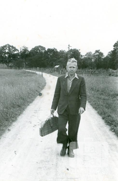 Otto Brekte uzvalkā ar somu rokās uz lauku ceļa pie Memmingenes nometnes (amerikāņu zonā) 1949. gada vasarā.