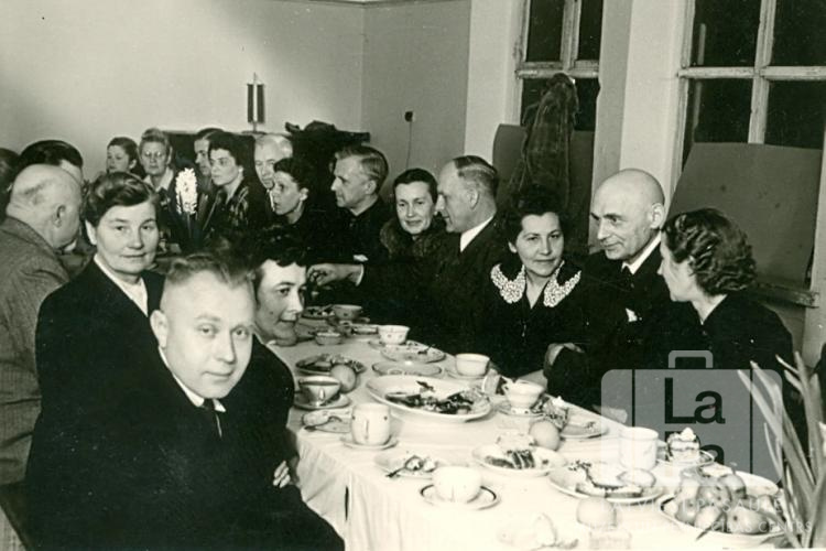 Pamatskolas 6. klases izlaiduma mielasts Memmingenē (amerikāņu zonā). Kreisajā pusē redzami: Otto Brekte, Ella Mazjāne un ? Gravelsīna. Labajā galda pusē: angļu valodas skolotāja Olga Baumane, nezināms, ? Reinfelde un mācītājs ? Zīrāks. Pārējie nezināmi.