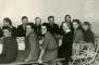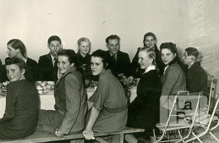 Pamatskolas izlaiduma mielasts Memmingenes nometnē (amerikāņu zonā). Priekšā, trešā no kreisās: Valija Melliņa. Aiz galda, no kreisās: Lia ?, Juris Reinfelds, Ārija Brekte (pr. Breikša), Juris Gravelsīs un Rūta ?.