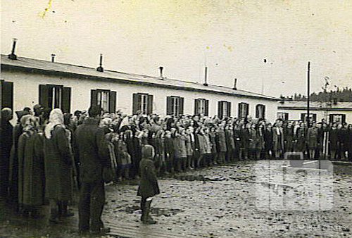 Par šo gadījumu Ārija Gulbis Saleda atceras: "IRO uzņēma filmu par "dīpīšiem" un lika visai nometnei stāvēt ap karogu. Laiks bija draņķīgs un lietains, un viss placis bija dubļos. Latvieši bija uzbūvējuši koka "trotuārus", uz kā staigāt no vienas barakas uz otru. Garā baraka pa kreisi ir nometnes skolas nams, un aizmugurē ir #7 baraka, kur dzīvoja Gulbju ģimene. Tā ceremonija tika filmēta un rādīta Amerikā kā ziņas notikums. Tādas ziņas tika rādītas pirms katras filmu izrādes kino zālēs, jo TV vēl nebija katram mājās - 1948. gadā."