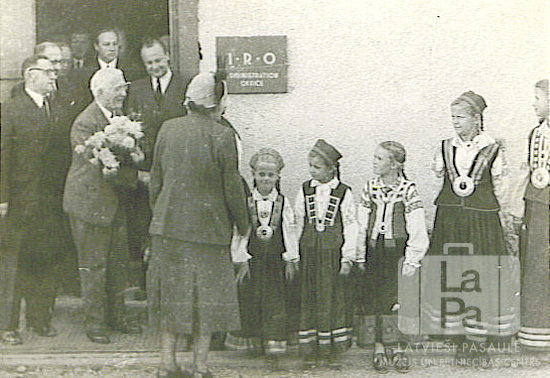 No ēkas nāk ārā uzvalkos un kleitās tērpti kungi un sievietes, tos sagaida meitenes tautastērpos. Ausmas nometne Kleinkeca (amerikāņu zona). Blakus durvīm zīme ar uzrakstu "IRO". Blakus zīmei stāv mācītājs ? Putniņš.