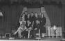 Teātru grupa kostīmos uz skatuves Ausmas nometnē Kleinkecā (amerikāņu zonā) ap 1946. gadu. Pirmajā rindā, otrā no kreisās: režisore, aktrise ? Kadeģis. Trešajā rindā, no kreisās: Gunārs Bisēns, Ēriks Krūmkalns un nezināms.