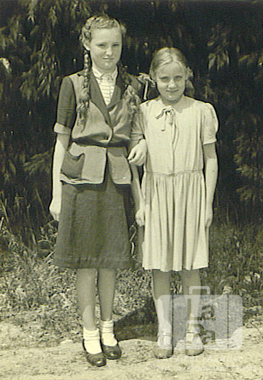 Divas draudzenes Ausmas nometnē Kleinkecā (amerikāņu zonā). No kreisās: Stefānija Kufnera, Ārija Gulbis (pr. Saleda).