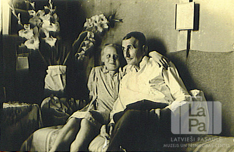 Ārija Gulbis (pr. Saleda) ar tēvu Ludvigu Gulbis viņa vārda dienā Ausmas nometnē Kleinkecā (amerikāņu zonā). Par šo gadījumu Ārija Gulbis Saleda atceras: "Svinam tēva vārda dienu mūsu istabā Kleinkecas nometnē."