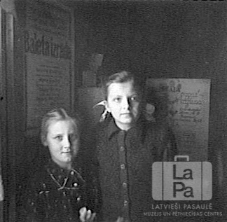 Divas meitenes stāv gaitenī (?), aiz viņām pie sienas afišas