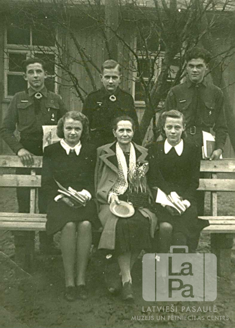 Latviešu pamatskolas absolventi Melles nometnē (angļu zonā). Priekšā, no kreisās: Irēne Līduma, klases audzinātāja ? Svene un Kitija Nogobāde. Aizmugurē, no kreisās: Zigurds Miezītis, Ansis Ābele un Ilmārs Miķelsons.